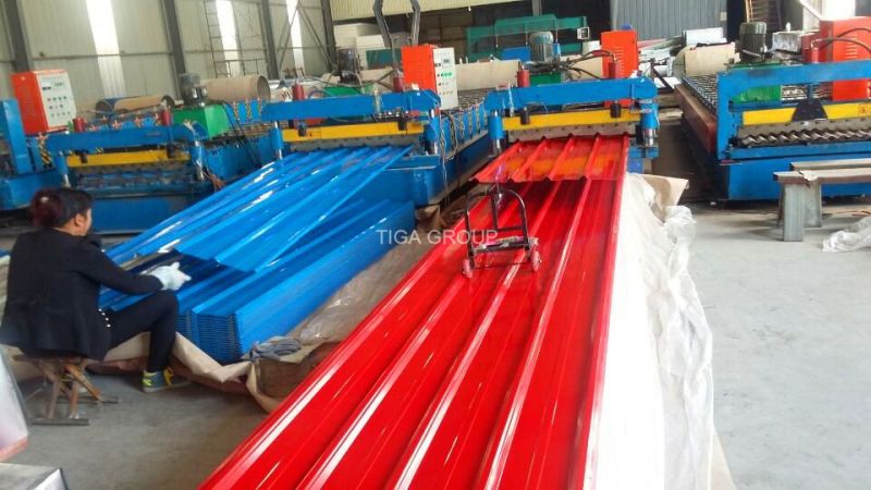 La feuille en acier de toit enduite par couleur est traitée près laminent à froid former la machine dans les profils required avec les matières premières de PPGI ou PPGL enroule, tôle d'acier enduite par couleur est employé couramment comme matériaux de toiture et de mur dans beaucoup de genres de constructions, telles que les constructions industrielles et civiles, l'entrepôt, le mur décoratif de construction, intérieur et extérieur particulier