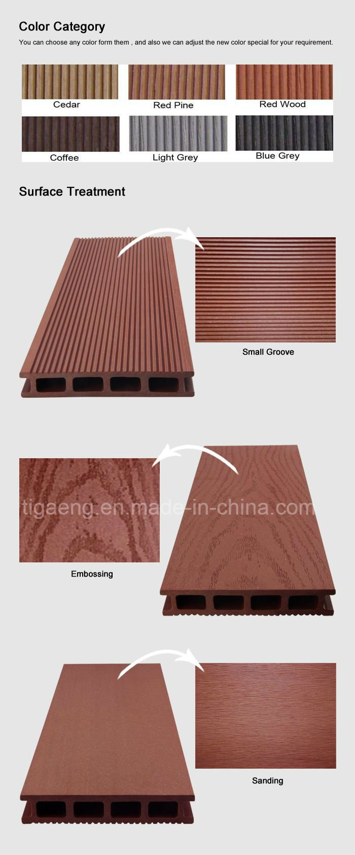 Produits de composé de bois-plastique de TIGA combiner les avantages des deux composants. L'apparence normale et la sensation chaude du bois sont combinées avec la résistance et la maintenance inférieure du plastique de haute qualité. Les produits de TIGA WPC sont idéaux pour toutes les applications extérieures
