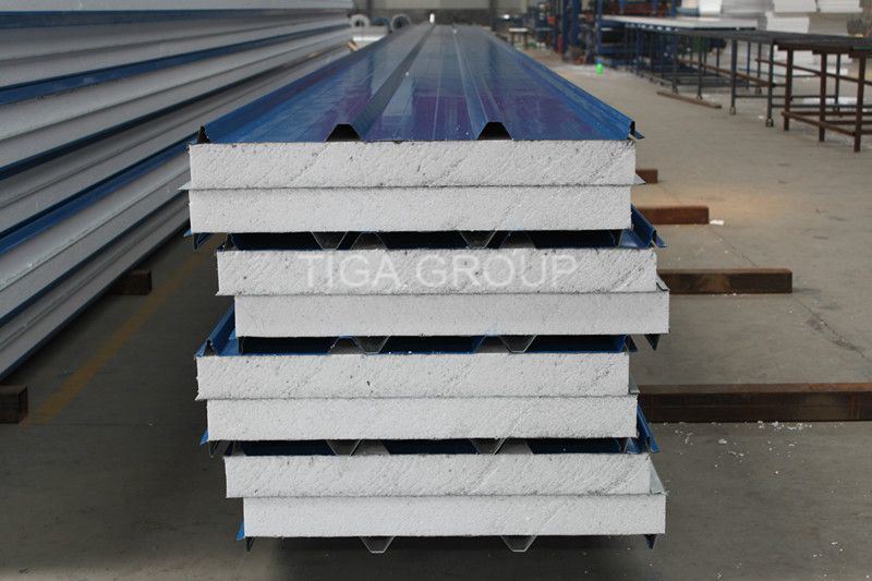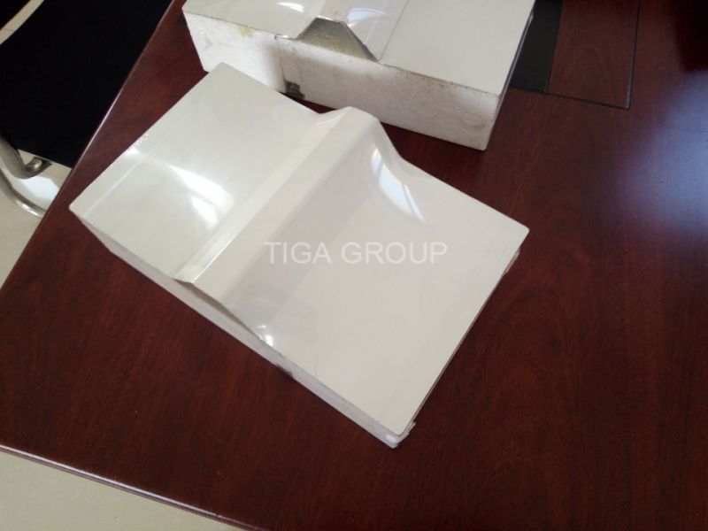 Panneau enduit d'acier de sandwich à couleur producted en combinant les matériaux de faisceau de tôle d'acier enduite par couleur et de laines de verre d'ENV, d'unité centrale, de laine de roche ou. Il est employé couramment aux ensembles industriels, entrepôts, storge froid, cadre empaquetant, boîtier en acier de lumière, la salle initiale de mezzanine de construction, salle du conseil d'administration d'activité, une série de salles propres, pièce climatisée