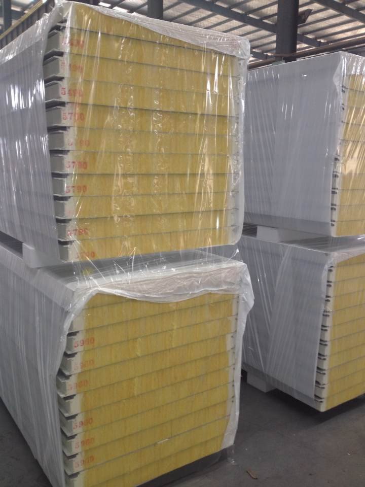 Panneau "sandwich" composé de rockwool se compose de trois composants. La tôle d'acier supérieure est faite par la tôle d'acier enduite d'une première couche de peinture ondulée, le matériau de faisceau est un meilleur rockwool d'isolation thermique, la tôle d'acier inférieure est fait par la tôle d'acier enduite d'un préenduisage plate. Tout ce trois composés adhesived par la colle.