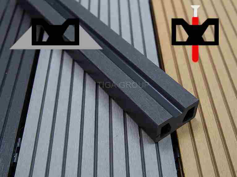 Après que tous les panneaux de decking de WPC soient verrouillés dans la place par les clips, le decking peut être complété en installant les tableaux latéraux de revêtement avec des vis.