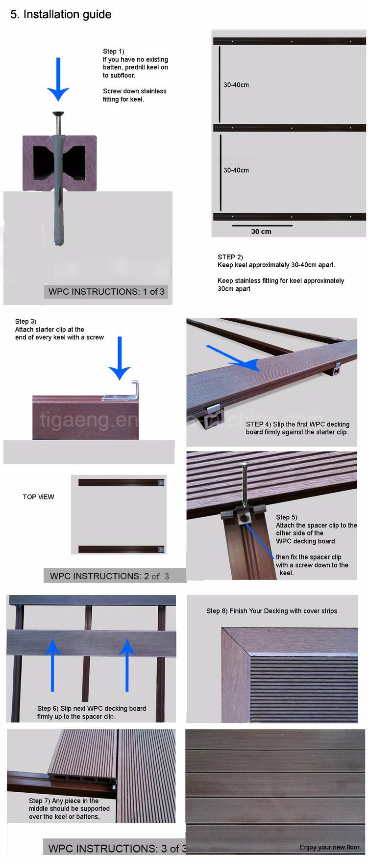 Les panneaux de plancher (WPC) composés de Bois-Plastique sont manufacturés d'une combinaison de la fibre normale de plastique et en bois et de quelques additifs using les matériels spéciaux. Elle mélange la fibre normale et le plastique en bois parfaitement pour garder l'impression normale du bois mais avec des couleurs riches de plastique. Elle a graduellement substitué le bois et le plastique, devenant employée couramment dans de plus en plus des domaines